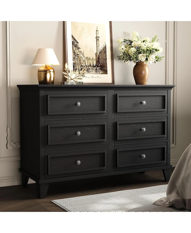 Store all your essentials in this modern black 6-drawer dresser, the wide wood chest features sleek metal handles and roomy drawers, making it perfect for bedrooms or living rooms, its sturdy design and contemporary style ensure reliable storage and easy organization.