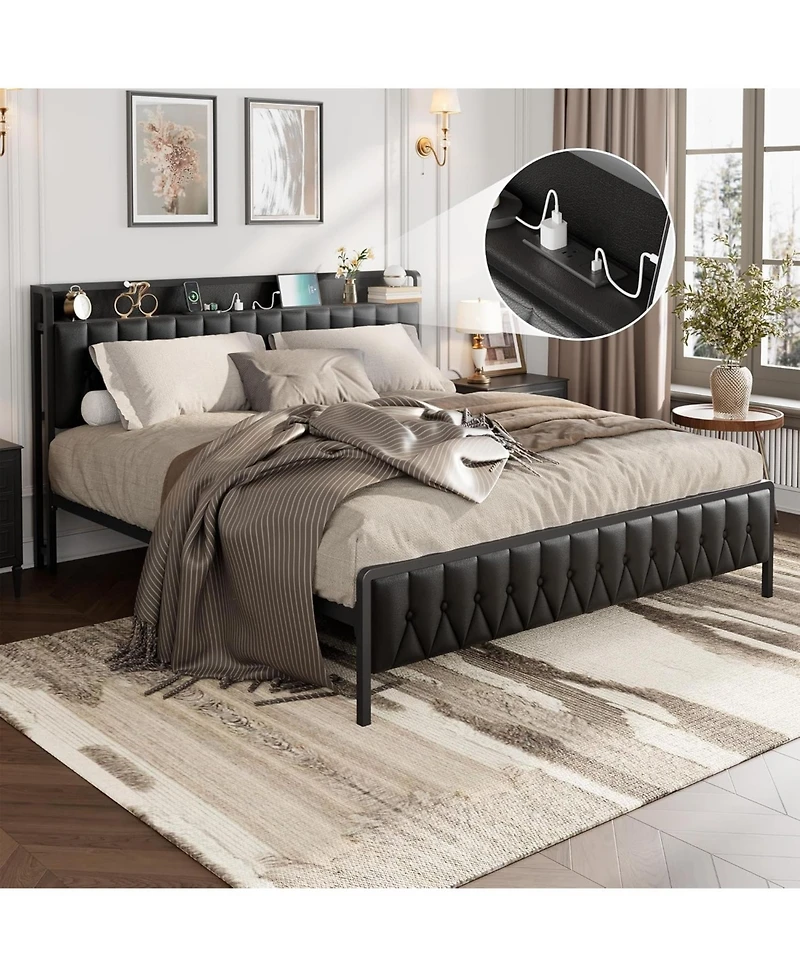 gaomon Contemporary Metal Bed Frame – King Size with Pu Faux Leather Button Headboard – Charging Station – 12" Underbed Storage