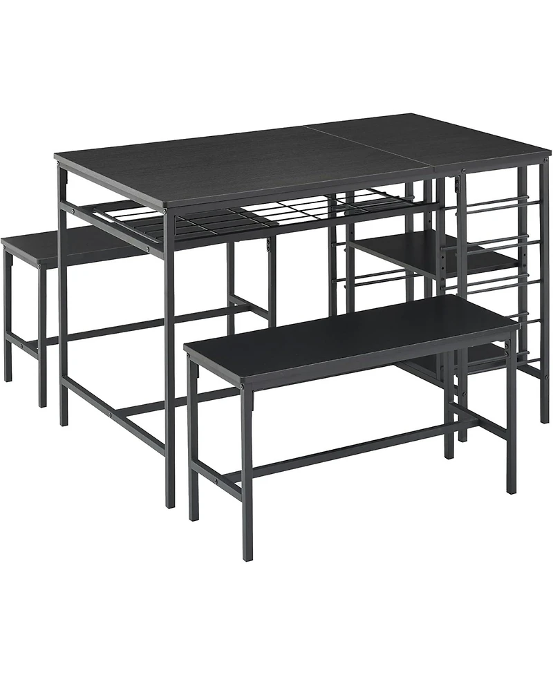 Compact black dining table set for four includes a 3-piece table with two benches, wine rack, and storage shelf.