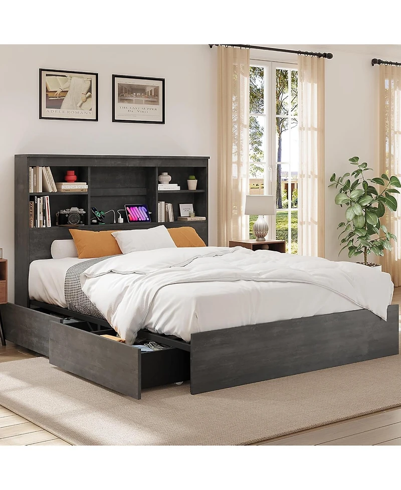 gaomon King Bed Frame with Storage Bookcase Headboard & 4 Drawers, Wood Platform Bed with Charging Station,No Box Spring, Ink