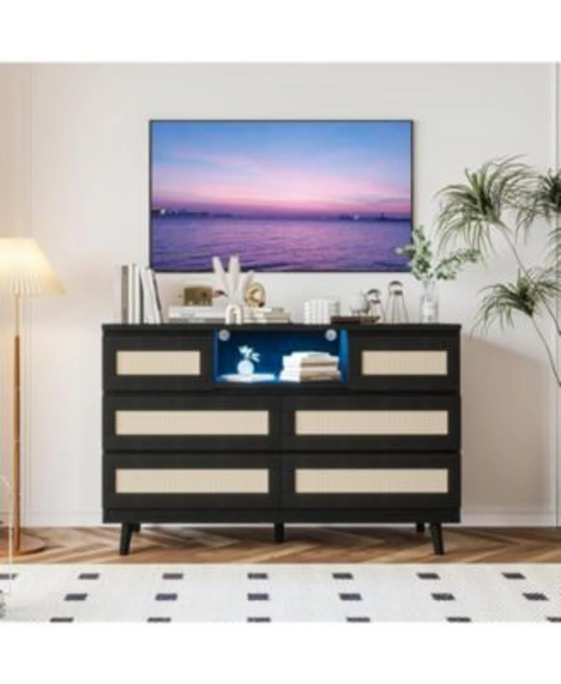 Slim Storage for Small Spaces: This rattan 6 drawer dresser is perfectly sized for compact rooms, offering four deep drawers, two smaller drawers, and an open cubby-ideal for apartments, bedrooms, or as an accent cabinet in the living room.Modern Farmhouse Design: With modern rattan accents and a clean wood finish, this slim dresser seamlessly matches farmhouse, mid-century, coastal, and contemporary interiors-making it a versatile choice for any bedroom or living space.Built-In Charging Station: Stay powered up with a wooden dresser featuring two Ac outlets and two Usb ports. Conveniently charge phones, tablets, or lamps-making this bedroom dresser with drawers a perfect fit for busy lifestyles.Customizable Led Lighting Ambiance: Set the mood with built-in Led lights controlled via button or app. Highlight your aesthetic tv stand dresser or display your favorite pieces while adding a cozy, customizable glow to your space.Durable Stability and Easy