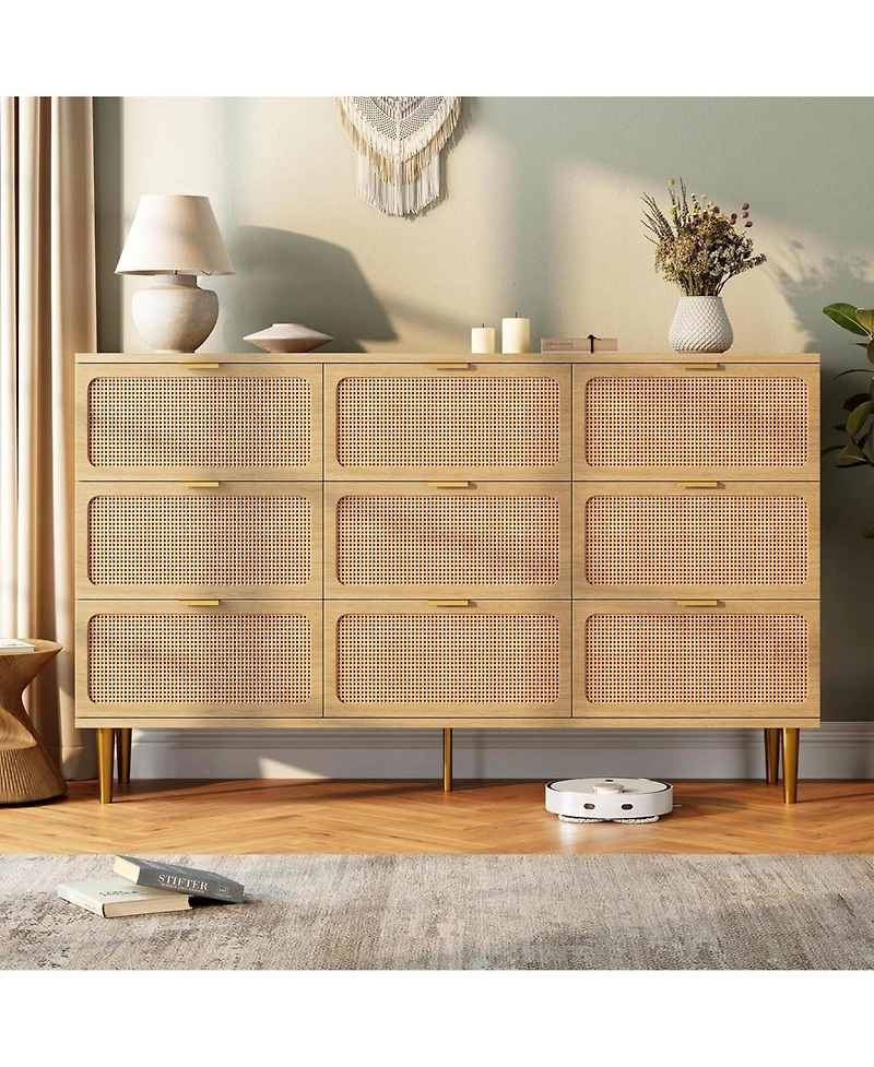 gaomon Rattan 9 Drawer Dresser for Bedroom, Tall Chest of Drawers with Deep Storage and Wide Top, Beige