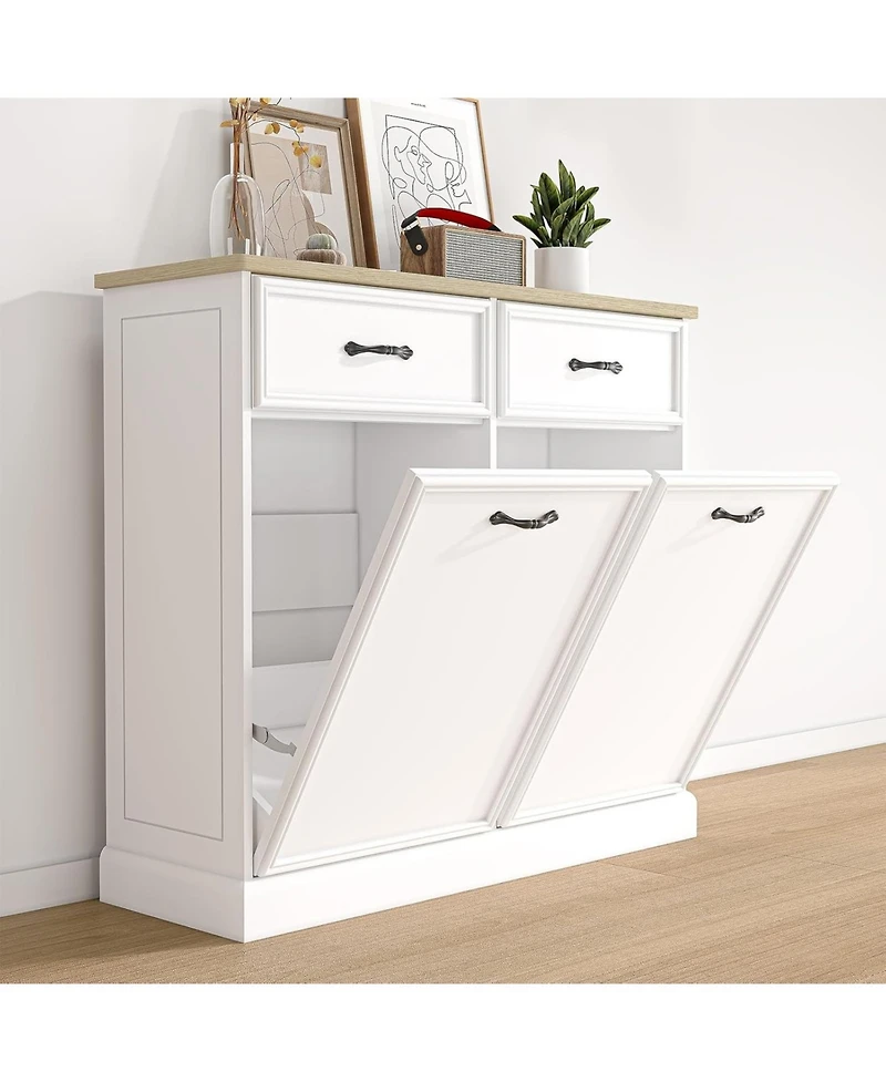 Stylish Hidden Cabinet - This trash can cabinet are designed to keep garbage and waste bins nicely hidden, maintaining a clean and organized appearance in your kitchen or living space. It can also prevent your dogs from entering the trash bin since there is no lid on top of the cabinet, reducing the risk of accidental spills, which is overall neat, decorative and pet-proof..easy Trash Disposal Design - The tilt-out feature of this trash cabinet allows for effortless waste disposal. By simply tilting the front panel, you can easily access and dispose of trash, eliminating the need to lift heavy garbage bags or bins. Two pull-out drawers and compartments offers additional storage space for recycling bins or cleaning supplies..sturdy Freestaning Cabinet - Both bottom and sides of our trash can cabinet are reinforced to handle the weight of garbage bins even fully loaded with waste (max 50 pounds). It can fit seamlessly into kitchen or utility room layouts