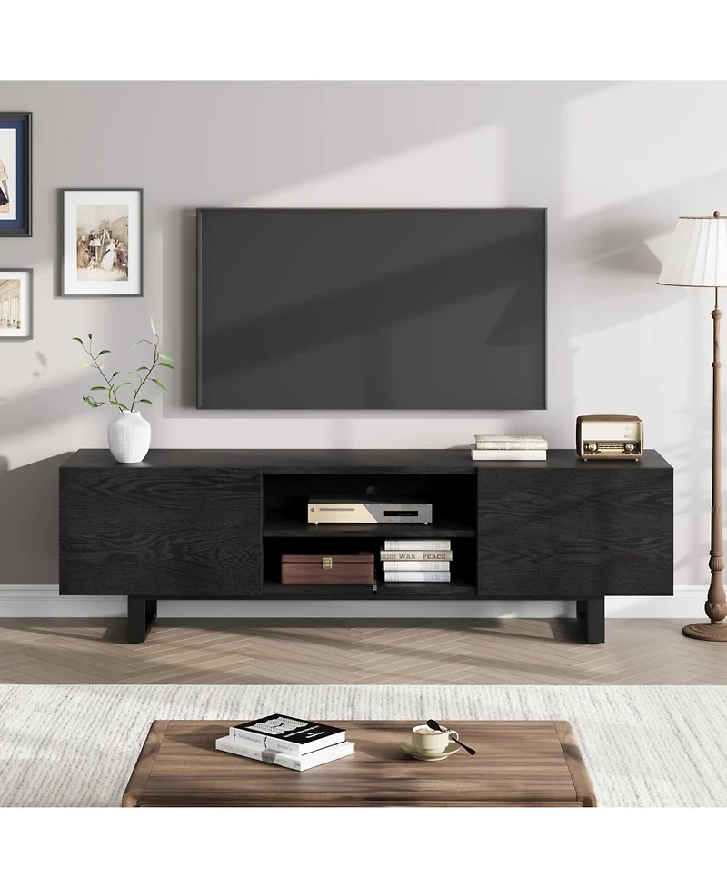 Industrial Tv Stand for 80" Tv with 2 drawers, heavy-duty metal legs, open storage, and modern black wood design.