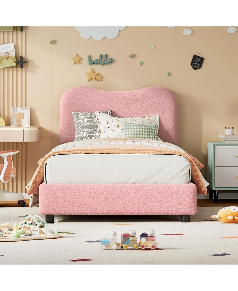 Add a modern touch with this pink boucle twin bed frame for kids, featuring a soft upholstered headboard and low profile design, heavy-duty wooden slats provide sturdy and noise-free mattress support, with no box spring needed, this bed is cozy, easy to assemble, and ideal for both girls and boys.