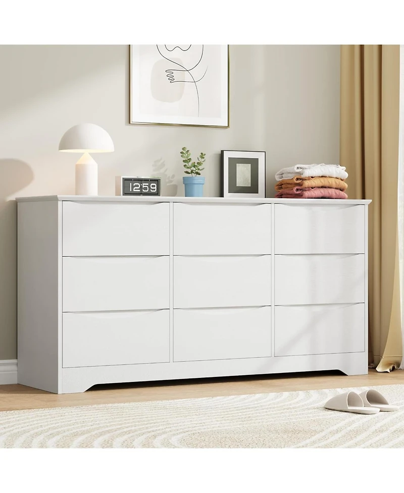 Wooden Dresser with 9 Drawers, Tall Modern Closet with Deep Storage, Large Chest of Drawers with Wide Top, Long Storage Dresser for Bedroom, Living Room, Hallway, Kids Room, White