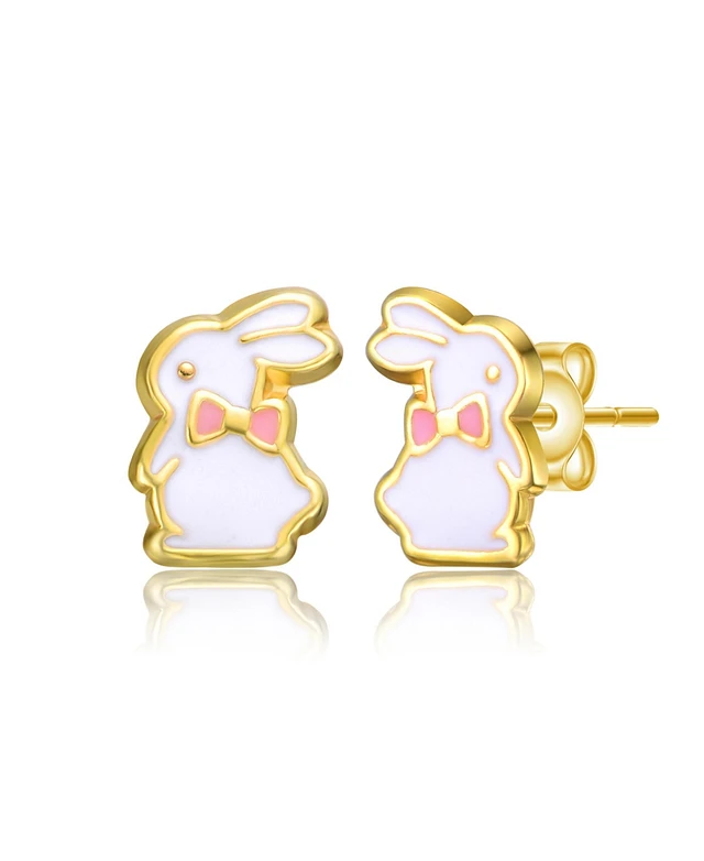 GiGiGirl Sterling Silver 14K Gold Plated White Enamel & Pink Bow Tie Bunny Rabbit Stud Earrings