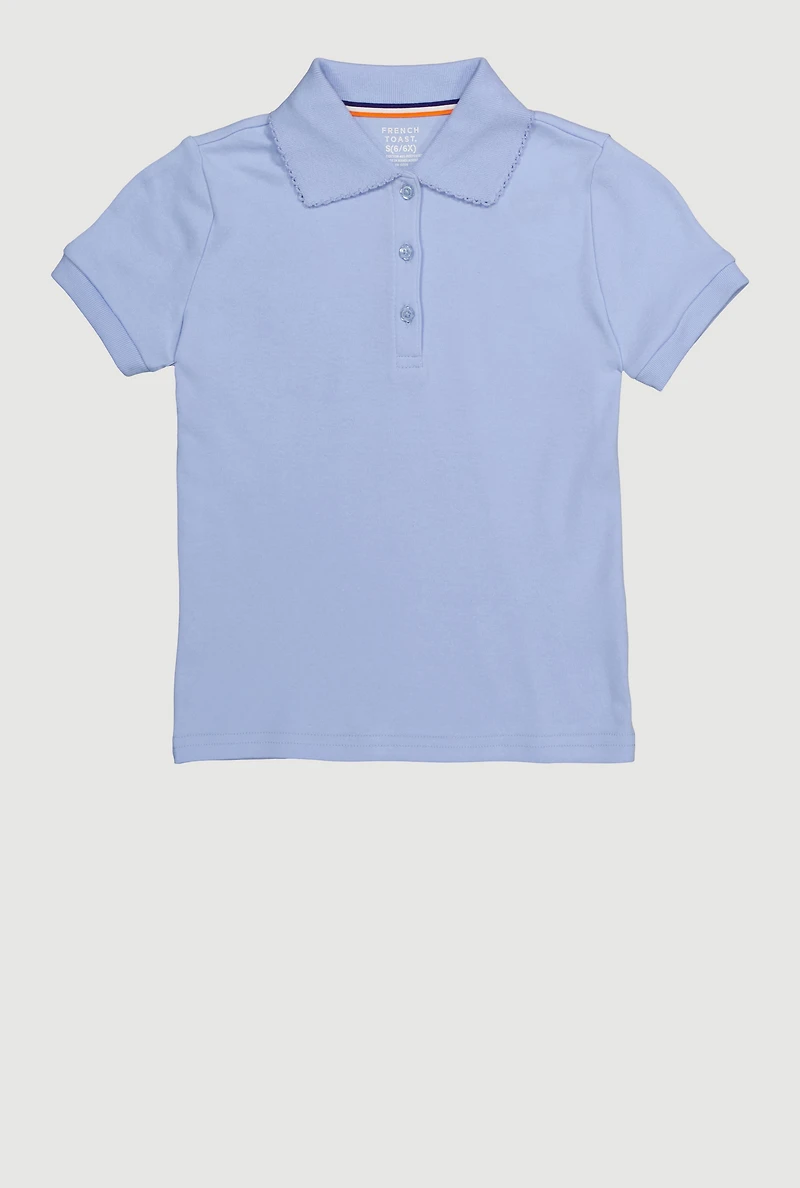 Get your little one ready for back to school with the French Toast Girls 4-6x Picot Polo Collar Shirt. This classic polo combines timeless style with everyday comfort, making it the perfect pick for school uniforms. The delicate picot flat knit collar adds a sweet, subtle detail that sets this shirt apart, while the pearlized buttons and stripe neck taping bring a touch of polished charm. Easy to pair and built for all-day wear, this polo is a must-have for stylish school days and beyond.