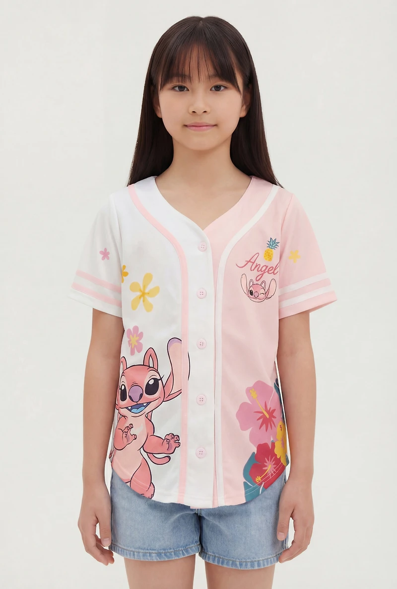 This Disney's Lilo & Stitch Angel baseball jersey features a V-neck and short sleeves for easy layering and movement. Crafted from breathable jersey mesh, it offers a sporty athleisure vibe perfect for casual days. The button-front closure adds a classic touch while the graphic print brings playful style to her everyday wardrobe.