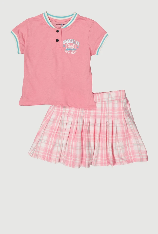 Girls Brooklyn New York Varsity Polo Shirt and Plaid Skirt, Pink, Size 7-8