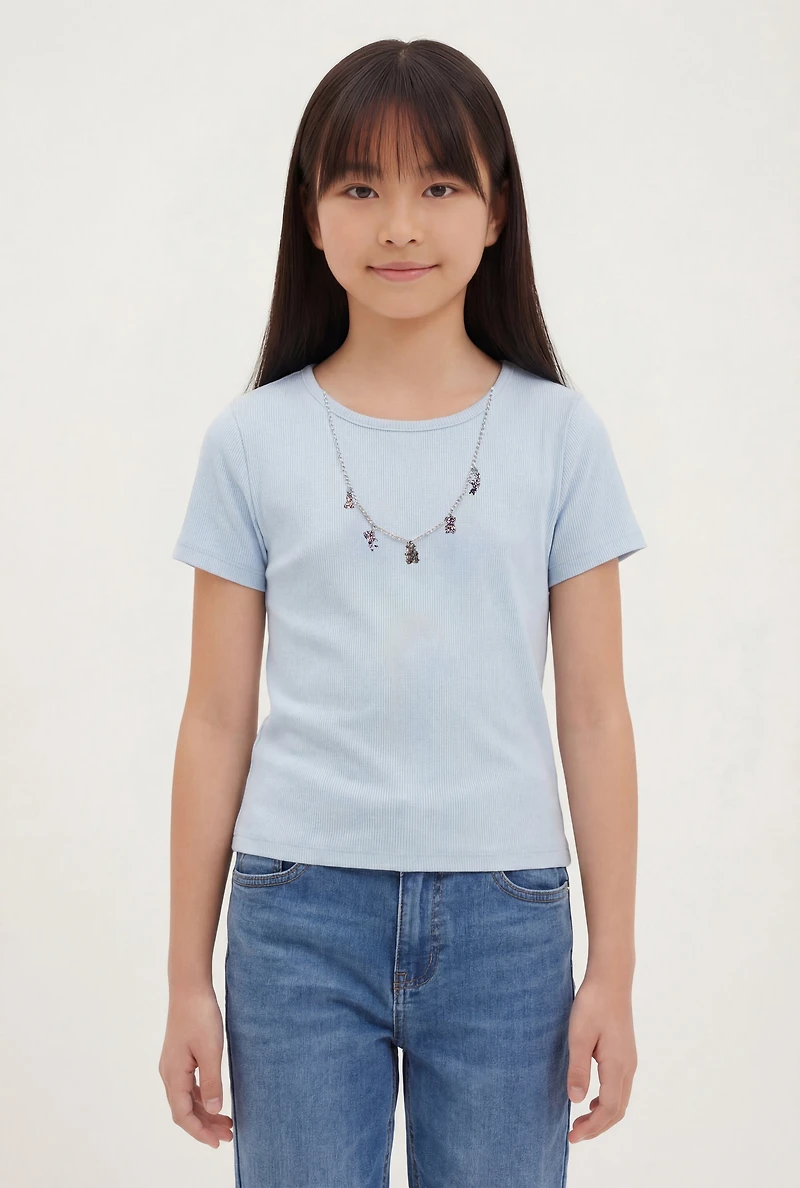 This girls' casual tee features a classic crew neckline and short sleeves crafted from soft ribbed knit fabric. It includes a removable charm necklace that adds a playful touch without sacrificing ease of wear, making it perfect for school days and weekend adventures.