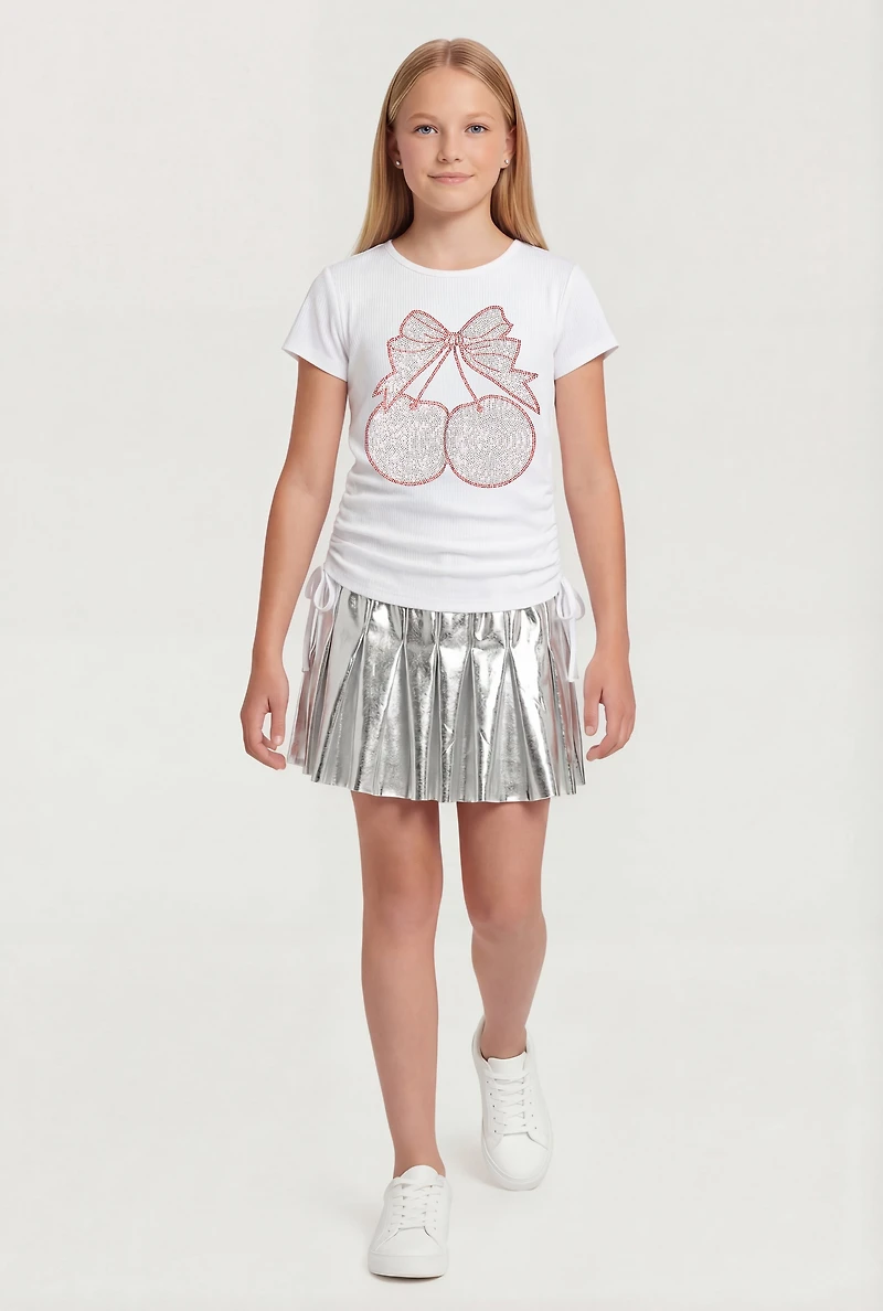 Girls Rhinestone Cherry Graphic Tee and Pleated Skort Set
