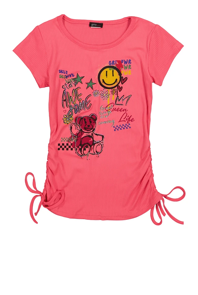 Girls Rhinestones Stay Awesome Graphic Ruched Top, Pink, Size 7-8