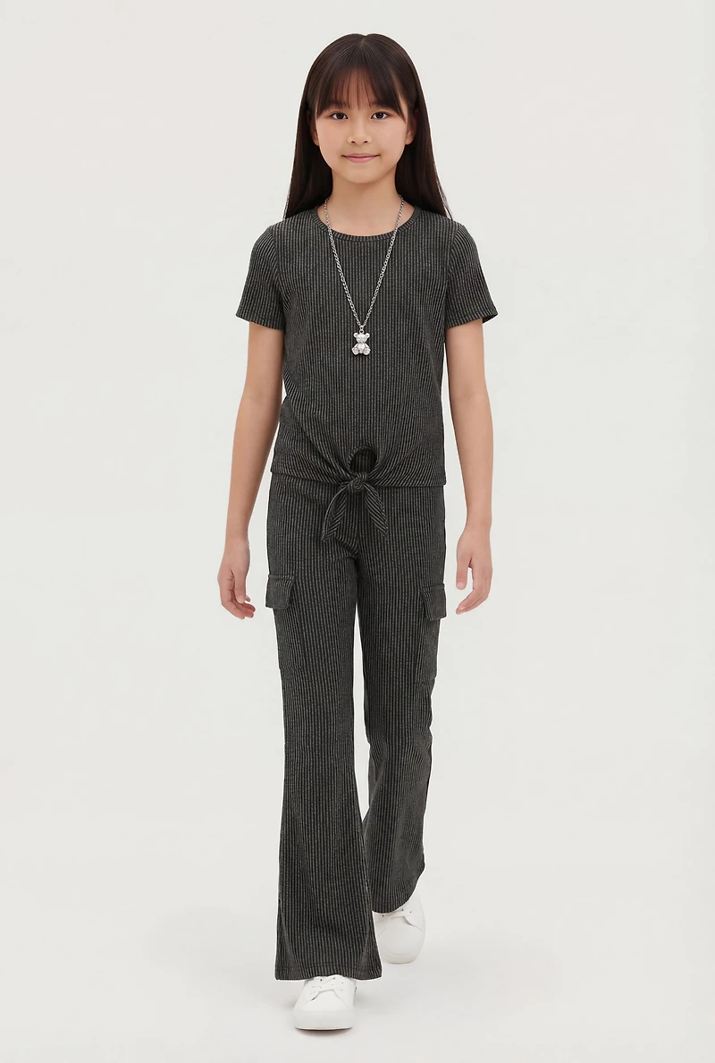 Girls Rib Knit Tie Front Tee with Necklace and Flare Pants