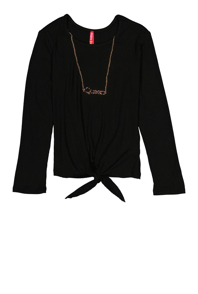 Girls Ribbed Knit Long Sleeve Top with Necklace, Black, Size 7-8
