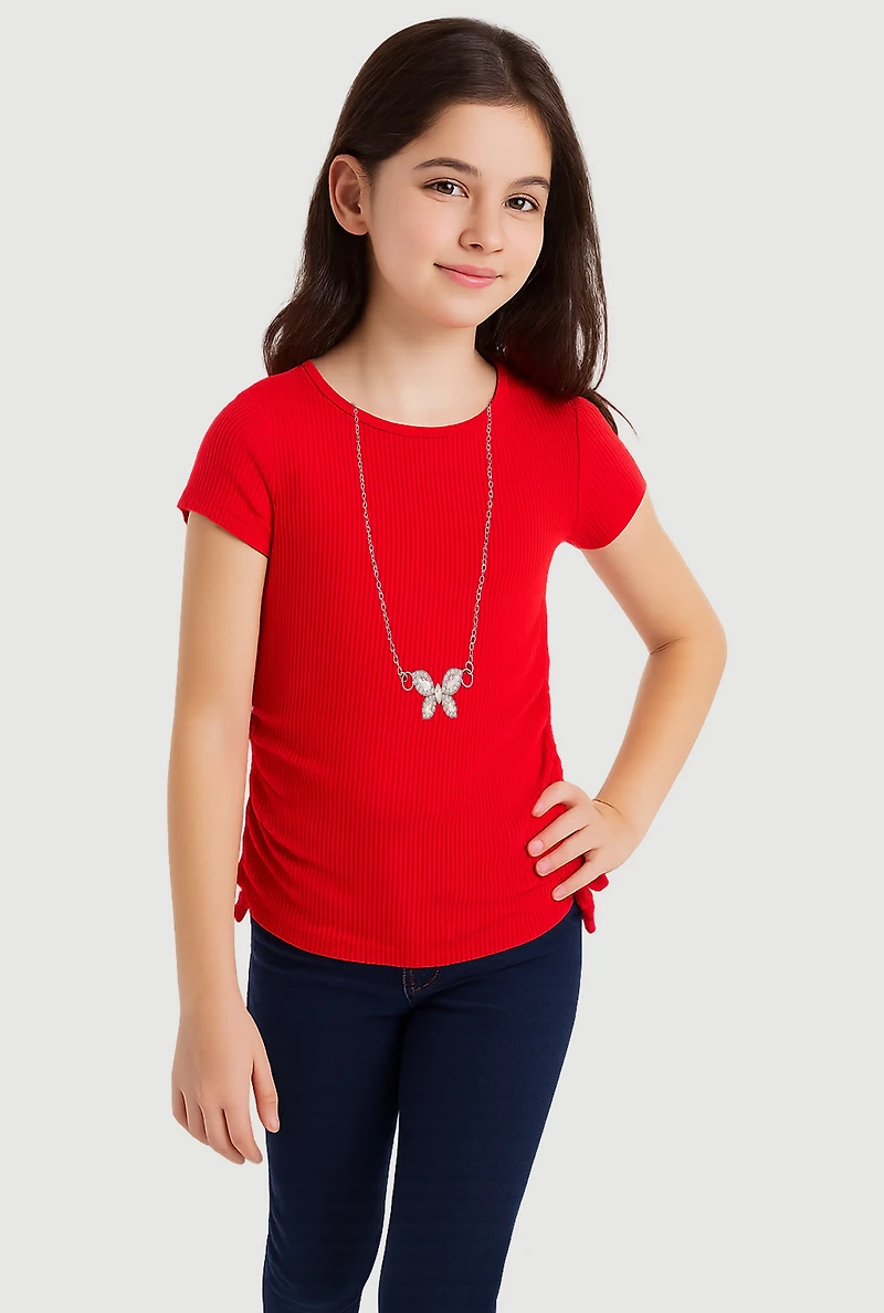 Girls Ribbed Knit Tee with Rhinestone Butterfly Necklace