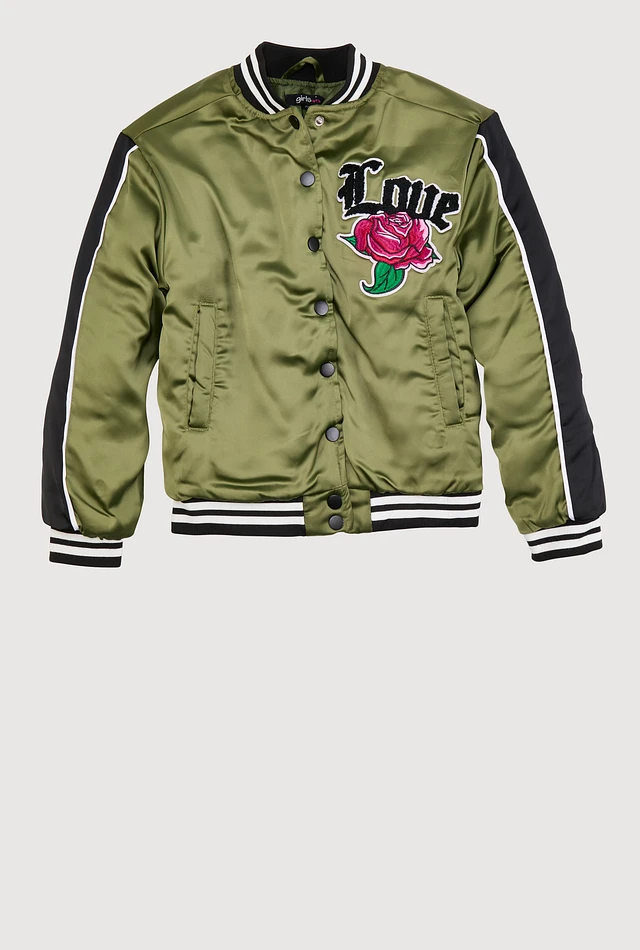 Girls Satin Love Chenille Patch Bomber Jacket, Green, Size 7-8