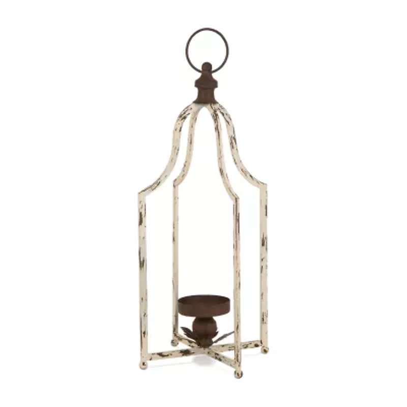 Infuse your home with light and love with distressed white metal lantern candle holder. It features an open lantern shape which is made of metal and detailed with a heavily distressed antique white finish. A single candle plate sits in the center for displaying your favorite color and scent of pillar candle. Add it to a shelf or mantel for instantly beautiful style.