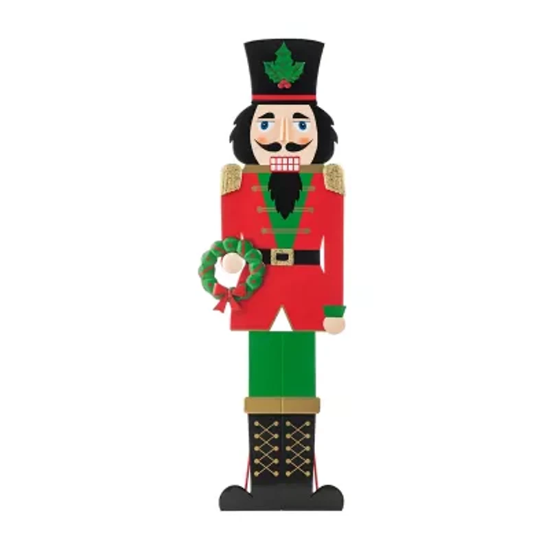 Bring seasonal greetings to your living room with this nutcracker porch decor. It's made of durable metal material and features a jumbo nutcracker holding a wreath in his hand. Tassel and belt is decorated with sequins and glitter powder which will give you a luxious look. It will offer a delightful way to greet guests on the front porch, or to add a splash of color and character like a guardian.