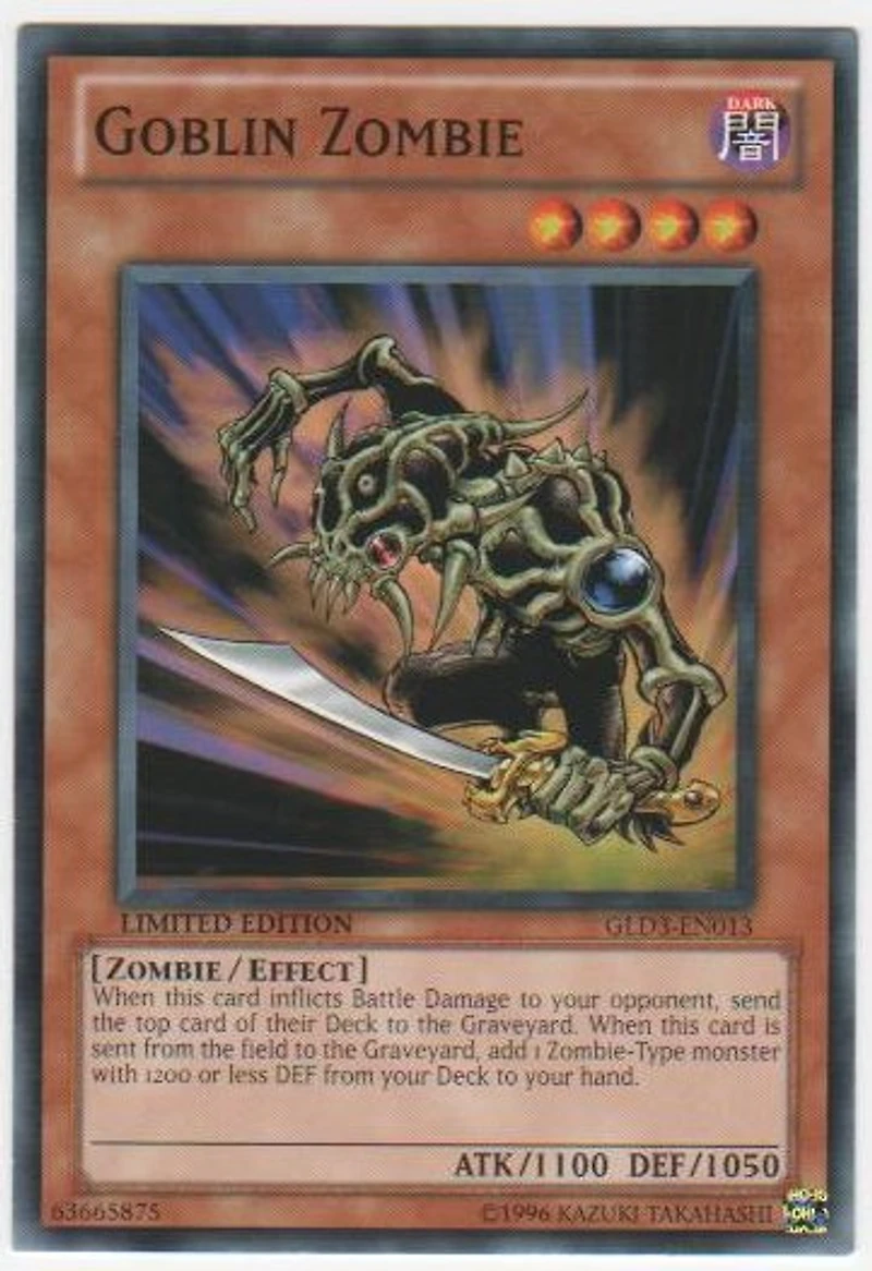 Card Rules: No Rulings Available for this card Passcode: 63665875 Set: Gold Series 3 ATK/DEF: 1100/1050 Card Number: GLD3-EN013 Monster Type: Zombie Rarity: Common Attribute: Dark Card Text: When this card inflicts Battle Damage to your opponent , send the top card of their Deck to the Graveyard. When this card is sent from the field to the Graveyard add 1 Zombie-Type monster with 1200 or less DEF from your Deck to your hand. Level: 4 Card Type: Effect Monster Name: Goblin Zombie Edition: Limited