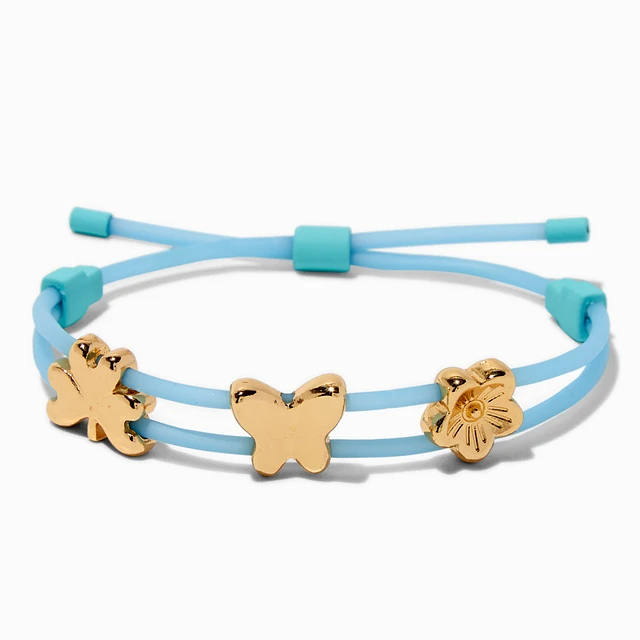 Gold-tone Clover, Flower & Butterfly Charm Blue Bolo Bracelet