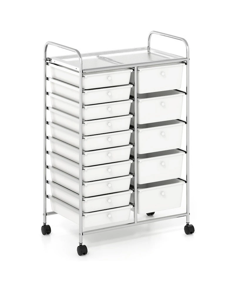 Featuring fifteen drawers in two depths across a 24.5 x 38 in chrome frame, this rolling trolley delivers 88 lbs of total storage capacity for demanding craft rooms and classrooms. Large 5 in drawers accommodate paper stacks while smaller 3 in drawers organize markers, scissors, and adhesives. The 22 lbs top shelf doubles as a workspace.