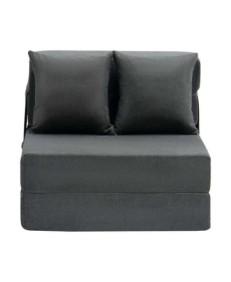 Transform any room with this 3-in-1 convertible sofa bed that works as a sofa, lounger, and flat sleeping surface. The 25D memory foam core delivers firm support for sitting and sleeping, while the removable washable cover keeps it fresh. Two matching throw pillows are included. The dark grey upholstery blends with modern interiors, and the foldable design stores compactly when not in use.