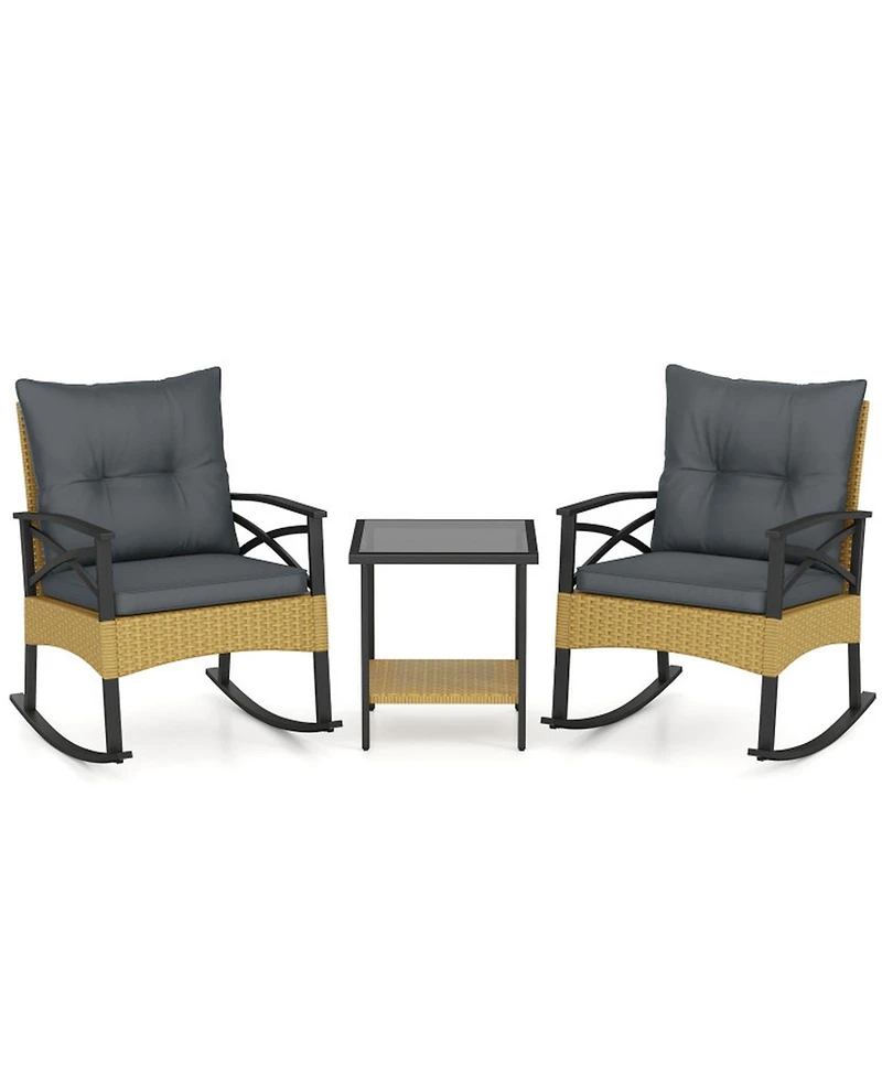 Create a peaceful retreat in your backyard with this 3-piece rocking set offering two hand-woven Pe rattan rocking chairs and a 2-tier tempered glass side table. Anti-slip pads and bottom stoppers provide safe, smooth rocking motion on any outdoor surface. High-density sponge cushions with thickened padding and removable covers ensure extended sitting comfort. The durable metal frame and sun-protective rattan deliver reliable outdoor performance across all seasons.
