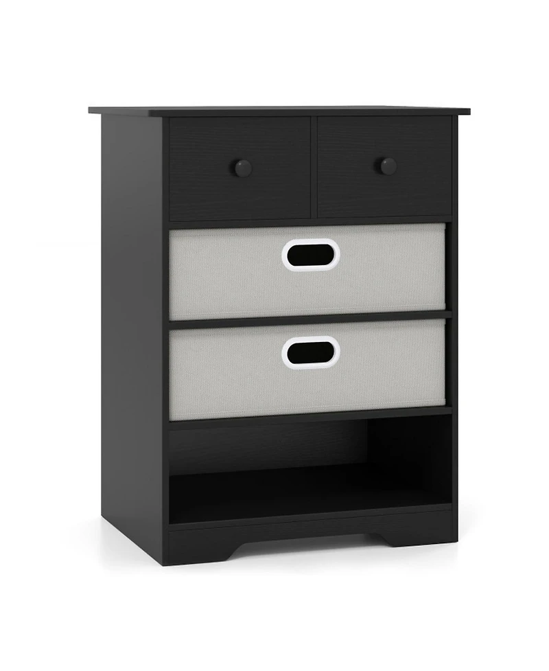 Designed for dynamic home organization, this modern chest dresser features four drawers and an open shelf for everything from folded clothing to decorative displays. Two foldable fabric drawers adapt to your needs, working as open cubbies when removed. Rounded corners prevent accidental bumps while two anti-tip kits and protective pads ensure safe, scratch-free placement. The sleek tabletop supports up to 100 lbs for versatile everyday use.