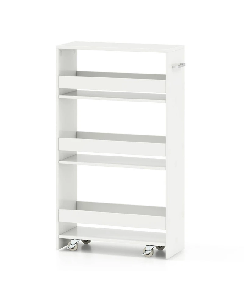 Designed to slip into narrow gaps between appliances, counters, or furniture, this four-tier slim cart turns unused space into organized storage. Three open shelves at varying heights accommodate spice jars, cleaning supplies, and bathroom essentials, while metal guard rails prevent items from sliding off during movement. A built-in push handle doubles as a convenient towel bar, and two lockable casters hold the cart firmly in place when needed.