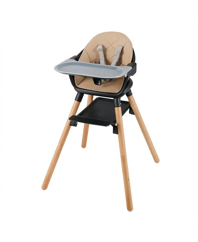 Built on four durable beech wood legs, this six-mode convertible high chair serves children from six months to six years with its expanded age range. The innovative double-tray system separates eating from play, with the upper tray for meals and the lower tray for activities. A two-level adjustable footrest grows with your child, and the waterproof Pu seat cushion wipes clean with a damp cloth for effortless maintenance.