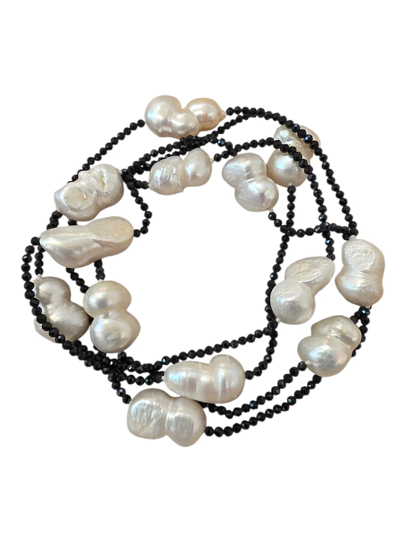 Elegant 36-inch necklace featuring lustrous baroque pearls paired with deep black spinel stones. Handcrafted with hypoallergenic materials, this piece combines organic pearl texture with the rich sophistication of spinel for a statement look. Perfect for layering or wearing solo, it transitions effortlessly from day to evening wear. Each strand celebrates the natural beauty of baroque pearls while maintaining comfort for sensitive skin.