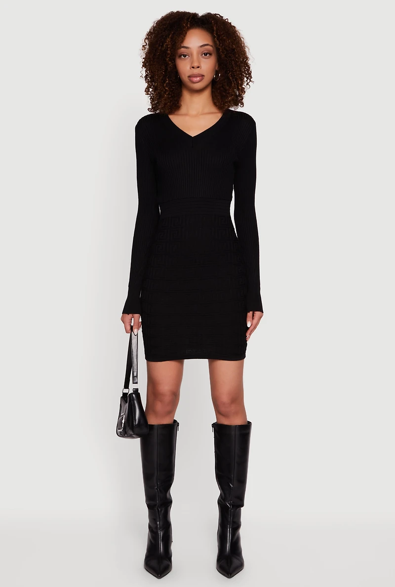 Step out in style with the Greek Key Rib Knit Long Sleeve V-Neck Sweater Dress. This curve-hugging, short-length dress features a flattering V-neckline and a chic geometric pattern inspired by the classic Greek key design. Crafted from soft ribbed knit fabric, it offers cozy comfort while keeping your silhouette sleek and stylish. Perfect for a night out or a party, this bodycon sweater dress effortlessly combines warmth and trend-forward appeal to make you the center of attention. Soft ribbed knit fabric for all-day comfort Flattering curve-hugging fit with a shaped silhouette Short length perfect for showing off your legs Elegant V-neckline to highlight your collarbone Eye-catching geometric Greek key pattern Ideal for nights out and party occasions Model Pictured Wearing Size S Height 5 ft 10 in, Bust 32 in, Waist 22 in, Hips 36 in Fits True To Size Measurements Full Length: 32 in Content and Care Material: 78% Rayon, 22% Polyester Care Instructions: Machine Wash, Tumble Dry Country Of Origin: China Rainbow Item Number 3094075171186 BLACK - 3094075171186001