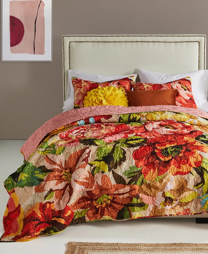 Steal the show in dramatic style with our Senna floral bouquet bedding. Bold colors and oversized blossoms dazzle the eyes and engage the senses. Your room will never be the same. Decorative flower pattern quilting completes the look. Reverses to an all-over blush. Oversized for better coverage on today's deeper mattresses. Lightweight for year-round layering and comfort. Use this set on the top of your bed, or as a colorful fashion blanket. Quilt set comes with quilt and two pillow shams (one sham per Twin set). Dimensions - Twin set includes one 68""x88"" quilt plus one 20""x26"" pillow sham. All dimensions +/- 2"". Machine quilted with fabric bound edges for durability. 100% brushed microfiber face and back with polyester fill (120 gram per square meter).