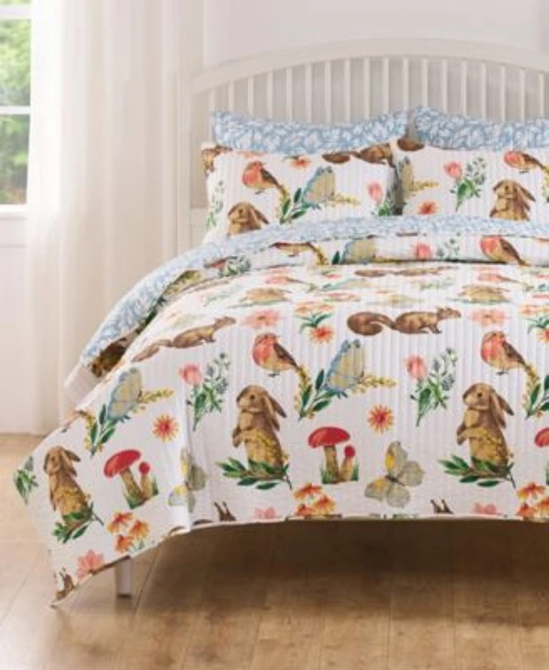 Bring a menagerie of friendly creatures into your home with the Willow collection. Bunny rabbits, squirrels, butterflies and songbirds welcome you to their peaceful garden of flowers and stately mushrooms. Lively pastel colors on a white ground coordinate with a variety on interior decor themes. Perfect for calming the mood, Willow reverses to a budding leaf print in sky blue. Machine quilted with fabric-bound edges for durability. 410 Grams per Square Meter.