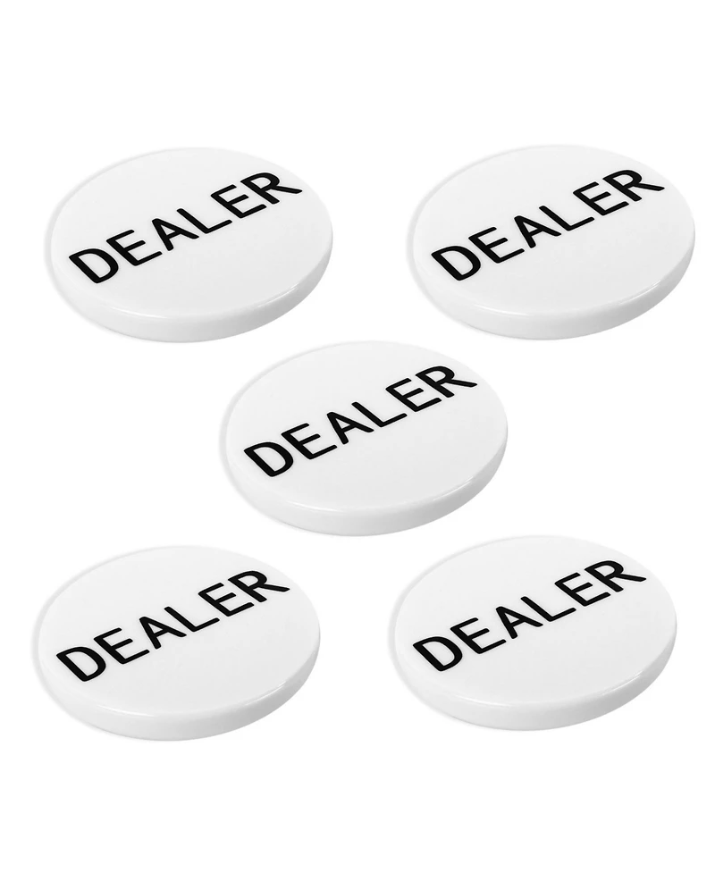 The poker dealer button set includes 5 dealer buttons, each button features easy-to-read lettering on both sides, with good print that won't rub off easily, and measures 2"" in diameter and 0.25"" thick. The set helps you distinguish the position of each poker player at the table, providing a better game experience without the need for additional temporary markers. The set is perfect for home games and tournaments.