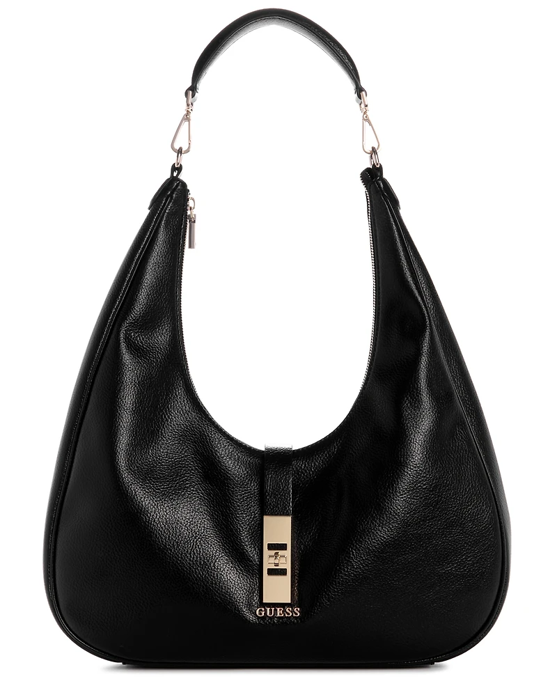 Crafted from a durable pebble-textured fabric, this Guess hobo handbag offers a spacious interior with a top zip closure. The shiny gold-tone hardware and removable charm add a stylish touch to the versatile shoulder strap design.
