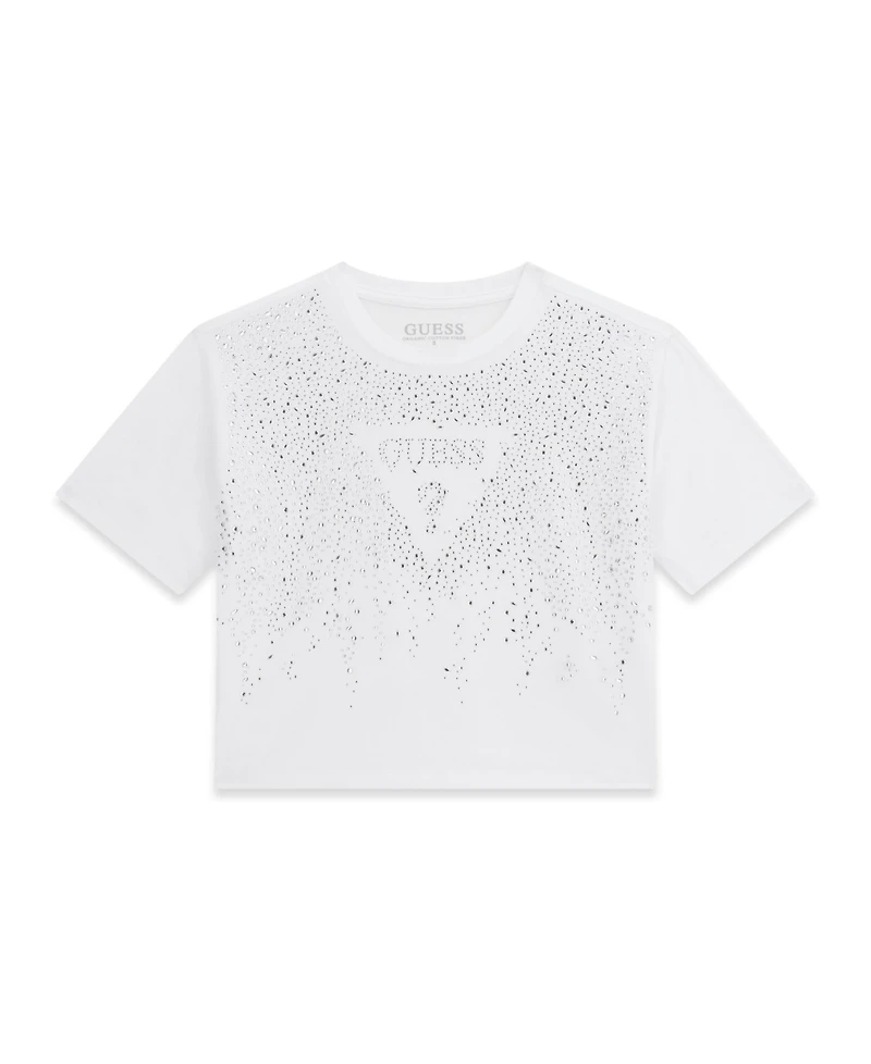 Make a sparkling statement in this Guess short-sleeve T-shirt, adorned with a heat-seal rhinestone logo. The round neckline and tagless interior offer a comfortable, stylish wear.