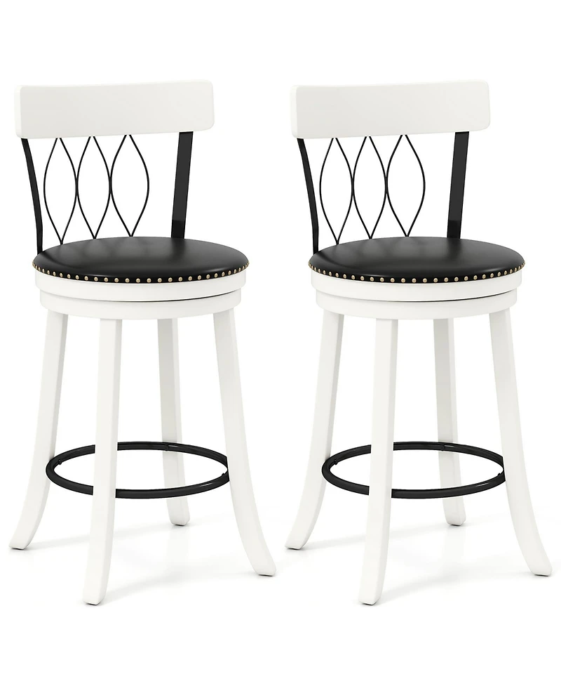 The 26'' bar stools prioritize comfort with their inclined backrests and footrests. They feature seats filled with supportive sponge and covered in high-quality Pvc leather. Constructed from solid rubber wood and metal, they are stable and come with protective foot pads. The swivel seat design allows for 360 degree rotation, making it convenient for conversations or reaching for items without having to move the stool. Additionally, these counter stools have a modern elegant look with metal patterns and tufted rivets, making them suitable for different settings.Features:Inclined backrest with a contoured surface promotes relaxation and reduces strainCozy metal footrest allows your guests to stretch legs and relax while seated360 degree swivel padded seat provides a comfortable and flexible seating option