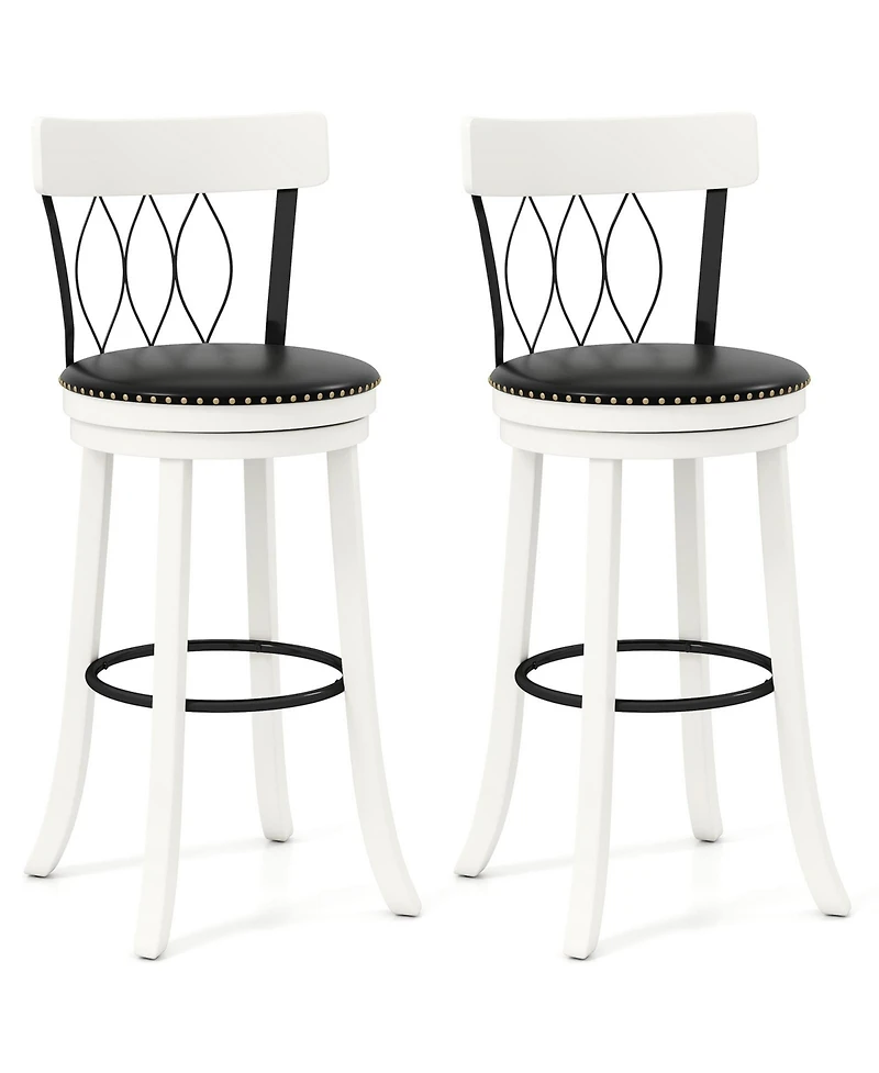 The 30'' bar stools prioritize comfort with their inclined backrests and footrests. They feature seats filled with supportive sponge and covered in high-quality Pvc leather. Constructed from solid rubber wood and metal, they are stable and come with protective foot pads. The swivel seat design allows for 360 degree rotation, making it convenient for conversations or reaching for items without having to move the stool. Additionally, these counter stools have a modern elegant look with metal patterns and tufted rivets, making them suitable for different settings. Features: Inclined backrest with a contoured surface promotes relaxation and reduces strain Cozy metal footrest allows your guests to stretch legs and relax while seated360 degree swivel padded seat provides a comfortable and flexible seating option.