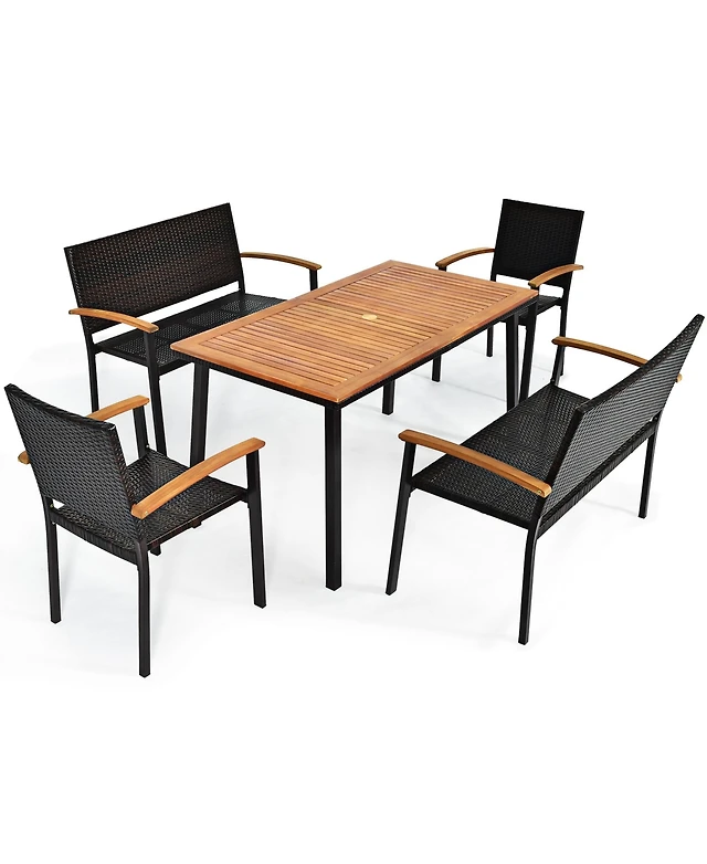 Gymax 5 Pcs Patio Dining Set Round Acacia Wood Table 4 Wicker Armchairs Outdoor Garden