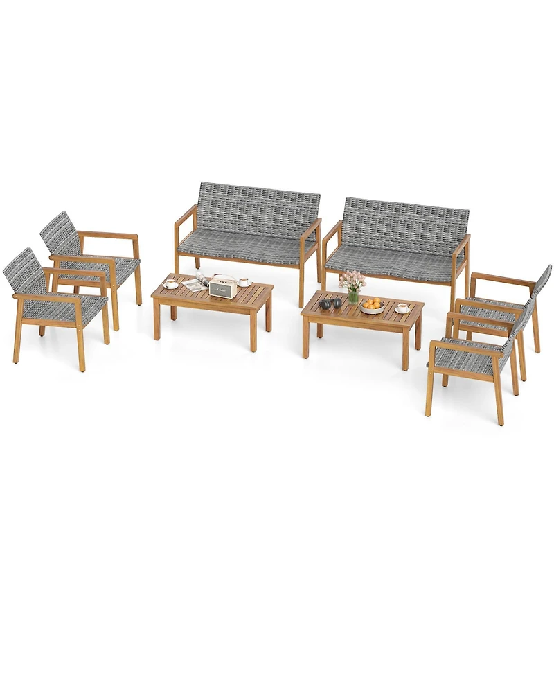 Enjoy the beauty of the outdoors with our 3/4 pieces patio furniture set!Crafted from natural acacia wood and hand-woven Pe rattan, this outdoor furniture set not only adds an elegant touch but also ensures long-lasting performance. The practical coffee table provides a perfect storage solution for drinks and other items. With a comfortable backrest and armrests, this patio conversation set is ideal for outdoor relaxation. The adjustable foot pads allow this 8 pieces patio bistro set to remain stable on uneven surfaces. With its modern appearance, this outdoor conversation set is a fantastic addition to any balcony, garden, or poolside area.Features:Solid acacia wood with exquisite craft for reliabilityHand-woven Pe rattan is colorfast and sun-protectiveConvenient coffee table for easy access to items
