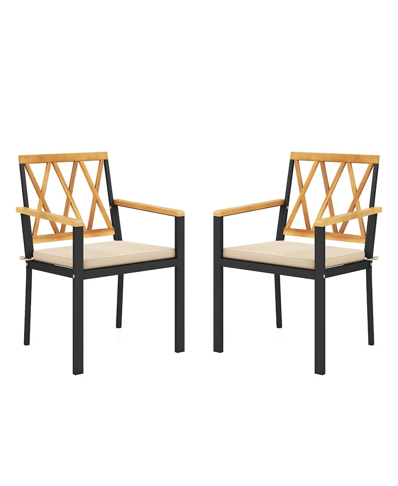 Our outdoor dining chairs are the perfect seating solution for any occasion!The outdoor metal chairs with foam padded cushion will effectively alleviates your fatigue. Featuring a 20'' wide seat, our bistro chairs are designed to accommodate adults comfortably. The ergonomically structured armrests and backrests provide additional support, ensuring a relaxing dining experience every time you sit down. Crafted with a solid metal frame, these dining chairs ensure a substantial load-bearing capacity of 400 lbs. The premium acacia wood backrest and armrests are smooth, crack-resistant and long-lasting.Features:Sturdy powder-coated metal frame is sturdy and not easy to deformArmrests and backrest are made of selected acacia wood for durabilityRemovable and washable seat cushion is filled with sponge for added comfort