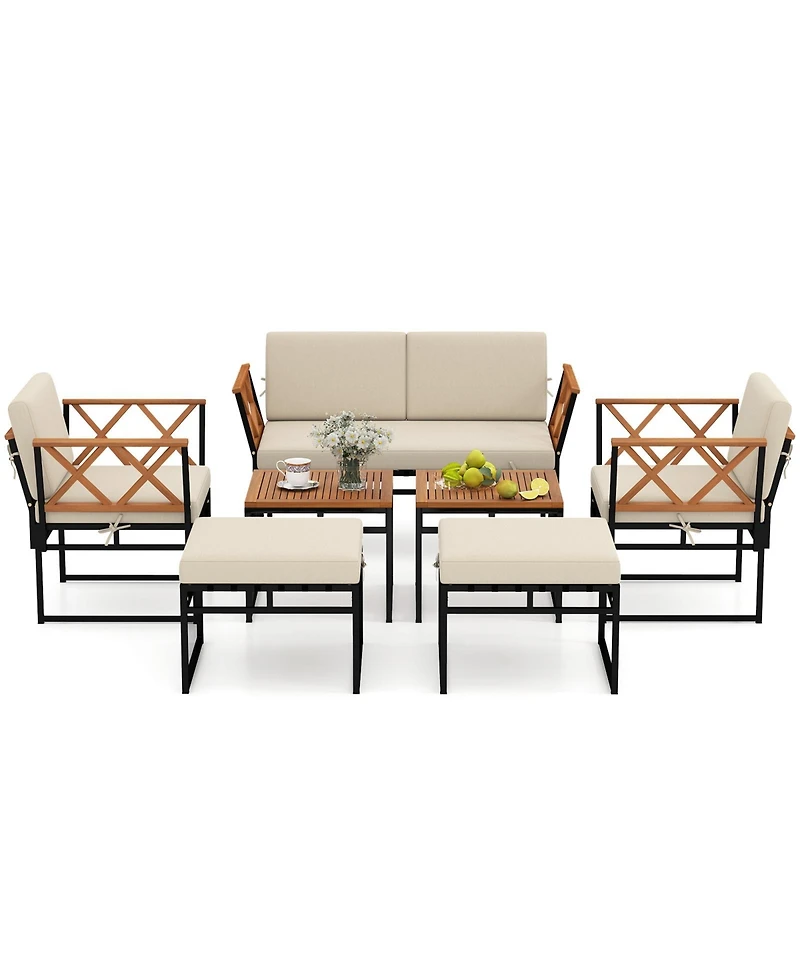 Experience the perfect fusion of exceptional durability and stylish comfort with this 7-piece patio set. Each piece of this sofa set is fortified with a heavy-duty metal frame capable of supporting substantial weight, ensuring unwavering stability and longevity. The inherent allure of anti-crack acacia wood not only imparts elegance but also ensures extended usability. Comfort is prioritized with the inclined backrests, cross-woven bungee seats, and plush cushions. This versatile collection, featuring premium details, consists of 1 loveseat, 2 armchairs, 2 ottomans, and 2 side tables. Create your serene oasis with this exquisite set, meticulously crafted for ultimate relaxation and style in any outdoor environment.Features:Heavy-duty metal frame provides robust supportSecure screw connection enhances structural integrityAcacia wood tabletop, armrest, and backrest exude natural elegance