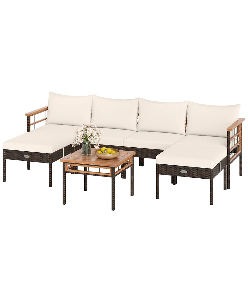 Enhance your outdoor space with this elegant 7-piece patio furniture set that combines natural charm and functional comfort. Crafted from mixed brown Pe rattan by hand and solid acacia wood with a smooth, splinter-free finish, this conversation set promises long-lasting beauty and strength. Plush cushions with ergonomic backrests and resilient sponge padding deliver exceptional comfort and support. The included side table adds practical space for drinks or decorative items.Features:Hand-crafted Pe rattan weaving offers natural style while providing sun protectionDurable acacia wood frame delivers a smooth, robust, and visually appealing surfacePlush sponge cushions ensure a comfortable and inviting seating experience