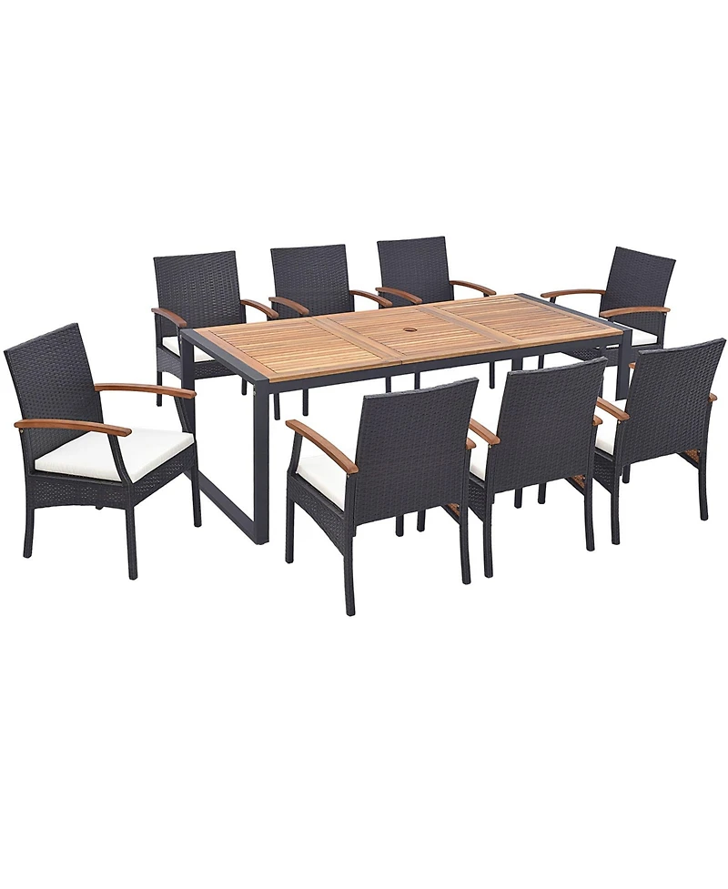 Our 9-piece outdoor dining set is ideal for hosting large family gatherings or elegant dinner parties under the open sky! Constructed from sturdy acacia wood, fade-resistant Pe rattan, and a durable metal frame, this patio table and chairs set ensures longevity and enhances the aesthetics of your outdoor space. The rectangular dining table features a 1.9'' umbrella hole, providing ample space for food and the option to add a patio umbrella (not included) for shade on sunny days. The ergonomic rattan chairs are equipped with soft cushions for a comfortable seating experience, and six chairs can be conveniently tucked under the table to maximize space.Features:Rustic acacia wood adds natural beauty to the setHeavy-duty metal frame provides strong supportSelected mix brown Pe rattan offers fade resistance and sun protection