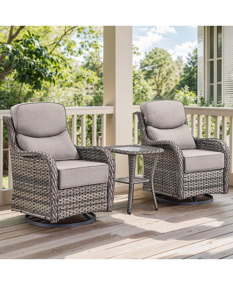 The Gymojoy Crescent 3-Piece Swivel Glider Wicker Patio Conversation Set offers the perfect blend of relaxation, durability, and modern outdoor charm. Featuring two swivel glider chairs and one matching end table, this compact set creates a cozy spot for morning coffee, sunset chats, or weekend lounging. Each chair provides smooth 360-degree swivel and gentle gliding motion, allowing effortless comfort while you unwind outdoors. The frames are constructed from rust-resistant, powder-coated steel and wrapped in handwoven Pe wicker that resists fading, cracking, and weather damage for long-lasting appeal. Plush 6-inch Olefin cushions deliver deep seating comfort with water-repellent and fade-resistant fabric for dependable performance in any season. The square wicker end table provides a stable surface for drinks or decor, completing the look with convenience and style. Perfect for patios, balconies, or small garden spaces.