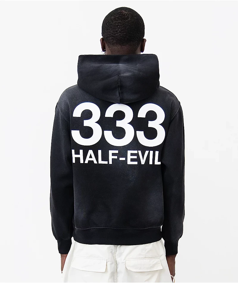 A vintage black wash sets the tone on the Logo hoodie from Half Evil with a small 333 logo at the chest and the same thing is presented larger on the back. The contrast between the soft fade and crisp lettering leans into an alt streetwear look. Buil