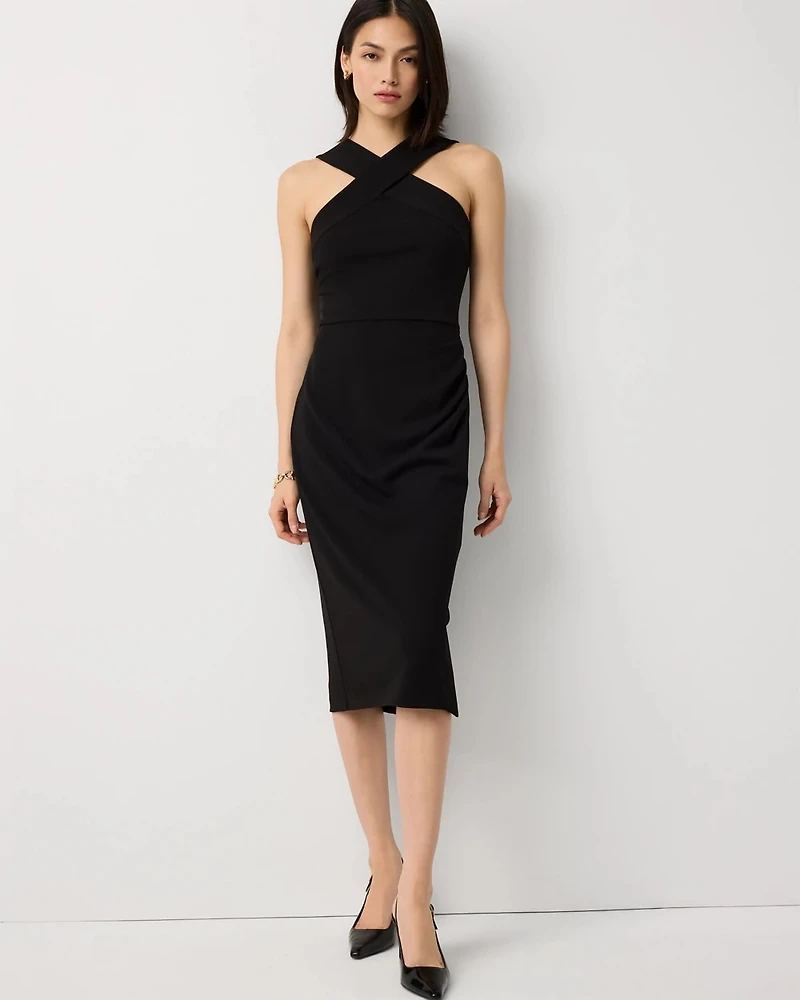 We gave this sheath dress standout details. This design features a fashion-forward crossover halter neck, plus side ruching for a flattering silhouette. Pair it with your favorite heels on date night.