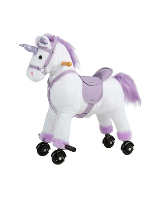 Give your toddler hours of fun, creativity, and imagination in a nursery, playroom, or daycare with the Unicorn Rocking Horse by Happy Trails. This hand-crafted stuffed animal rocker features a sturdy wooden base with curved rails that create a smooth forward and back rocking action on flat surfaces. As your little one laughs and plays, the saddled baby rocking horse helps them release pent-up energy, and improve their muscle strength, balancing skills, and coordination.
